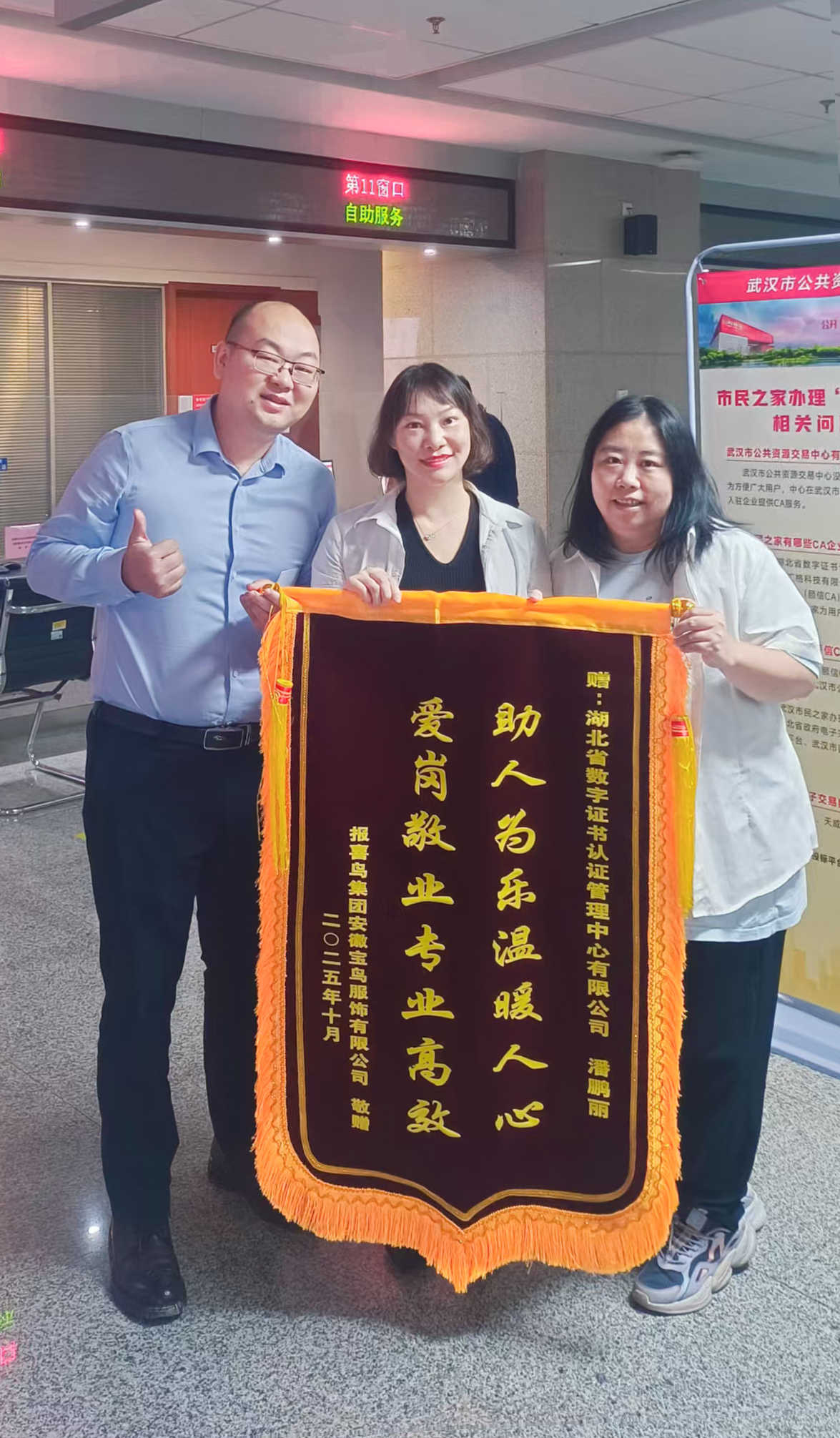 当晚九点多,客户紧握着来之不易的U-Key,满怀感激地离开,并在潘鹏丽的远程指导下,如期赶上了第二天的投标。不久后,客户专程为潘鹏丽送来锦旗,并传来捷报:“感谢你们!我们的项目中标啦!”
